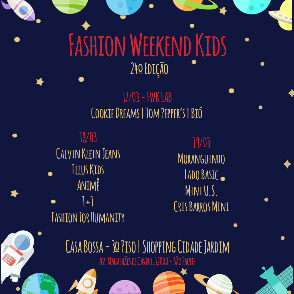Acontece nos dias 17, 18 e 19 de março a 24ª Edição do Fashion Weekend Kids, na Casa Bossa, no Shopping Cidade Jardim, em São Paulo, sob o comando do escritório Ana Cury Consultoria. Em um cenário lúdico que explora o conceito “Na Galáxia”, a passarela do evento será palco das principais novidades para o Inverno 2017 de consagradas marcas do mercado infantil.