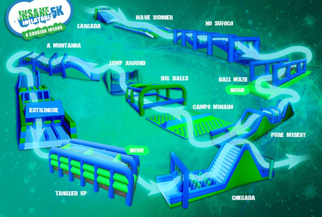 O trajeto da Insane Inflatable 5k – A Corrida Insana é algo nunca antes visto em nenhuma outra corrida. A extensão do trajeto é de aproximadamente 5 quilômetros (3.1 milhas), apesar de cada local oferecer um terreno diferente. A ideia é que se complete o percurso sem se preocupar com quem é o mais rápido, mais habilidoso ou talentoso.