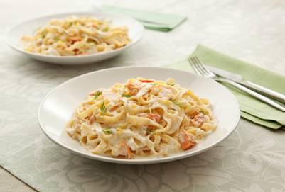 – Em uma panela grande ferva 5 litros de água com o sal. Cozinhe a massa durante o tempo indicado na embalagem. Deixe escorrer a massa, e depois acrescente ao molho. Junte as lascas de salmão e misture bem para que toda a massa fique bem envolvida pelo molho. Finalize com o dill e sirva em seguida.