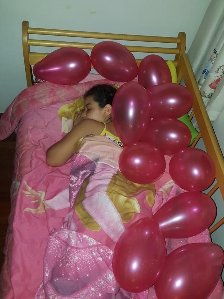 E o dia especial dela começou com a surpresa ao acordar, ela acordou olhou em volta e começamos a festa de estourar todas!!!