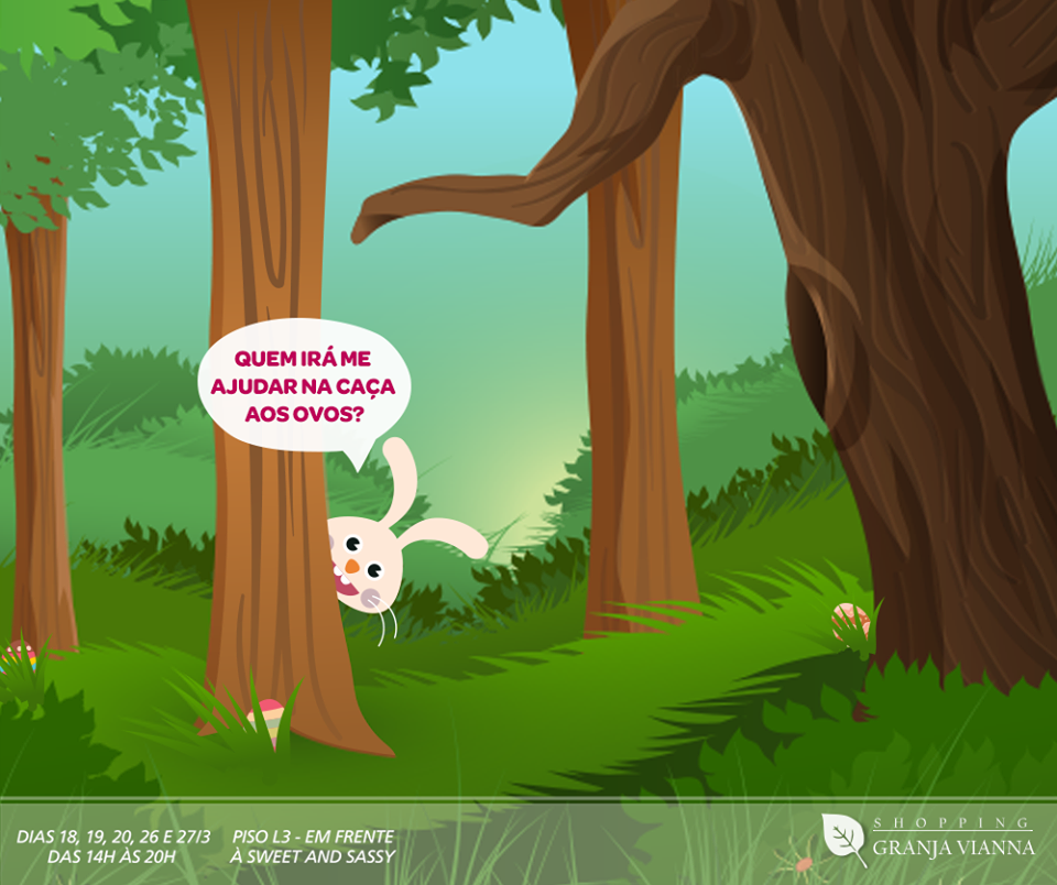 Nos dias 26 e 27 de março toda a família está convidada para brincar na Caça a Toca do Coelho do Shopping Granja Vianna. A ação será feita nos moldes de uma gincana onde as crianças irão circular por todo o empreendimento junto com monitores em busca de dicas para chegar até o fim do circuito onde cada criança ganhará um prêmio ao encontrar o esconderijo do Coelho da Páscoa.