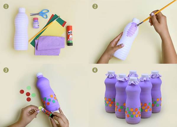 Passo 2: Recorte os papéis coloridos em bolinhas ou outros símbolos para colar nas garrafas com Pritt Bastão.