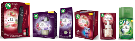 A linha possui três opções de fragrâncias desenvolvidas por meio de exclusivas combinações de essências da vida real: Doces Dias de Lavanda, composta por pétalas de lavanda, frutas vermelhas e algodão doce, Jardim Místico, composta por marshmallow, framboesa e rosa, e Frescor da Cachoeira, composta por blueberry, menta fresca e água de coco. Fazem parte da linha: Air Wick Life Scents Freshmatic, Air Wick Life Scents Óleo Perfumado, Air Wick Life Scents Difusor e Air Wick Life Scents Vela.