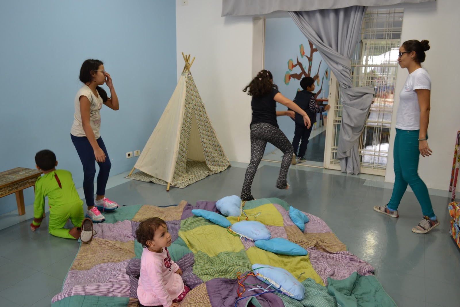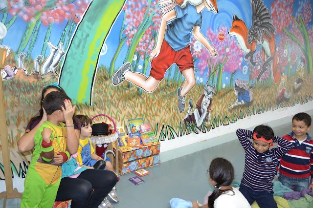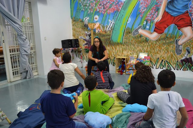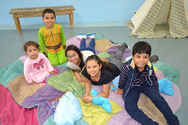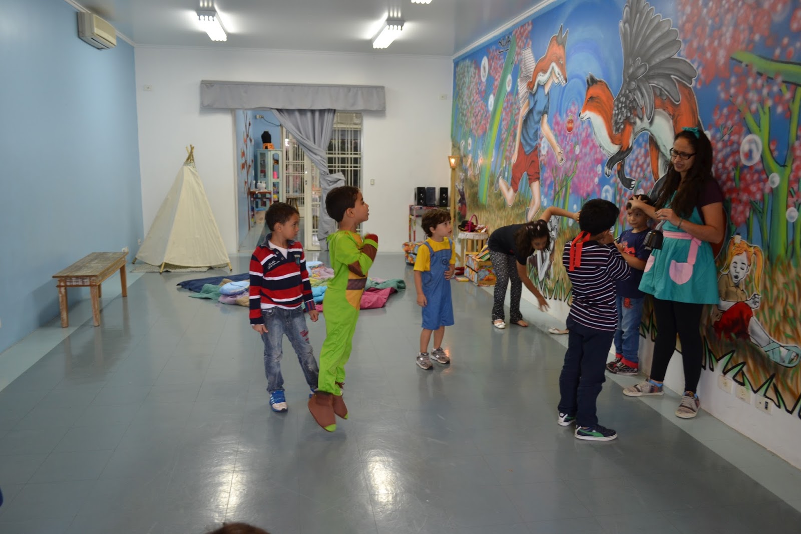 As crianças escutaram histórias e fizeram parte dela, ficaram tão alegres.