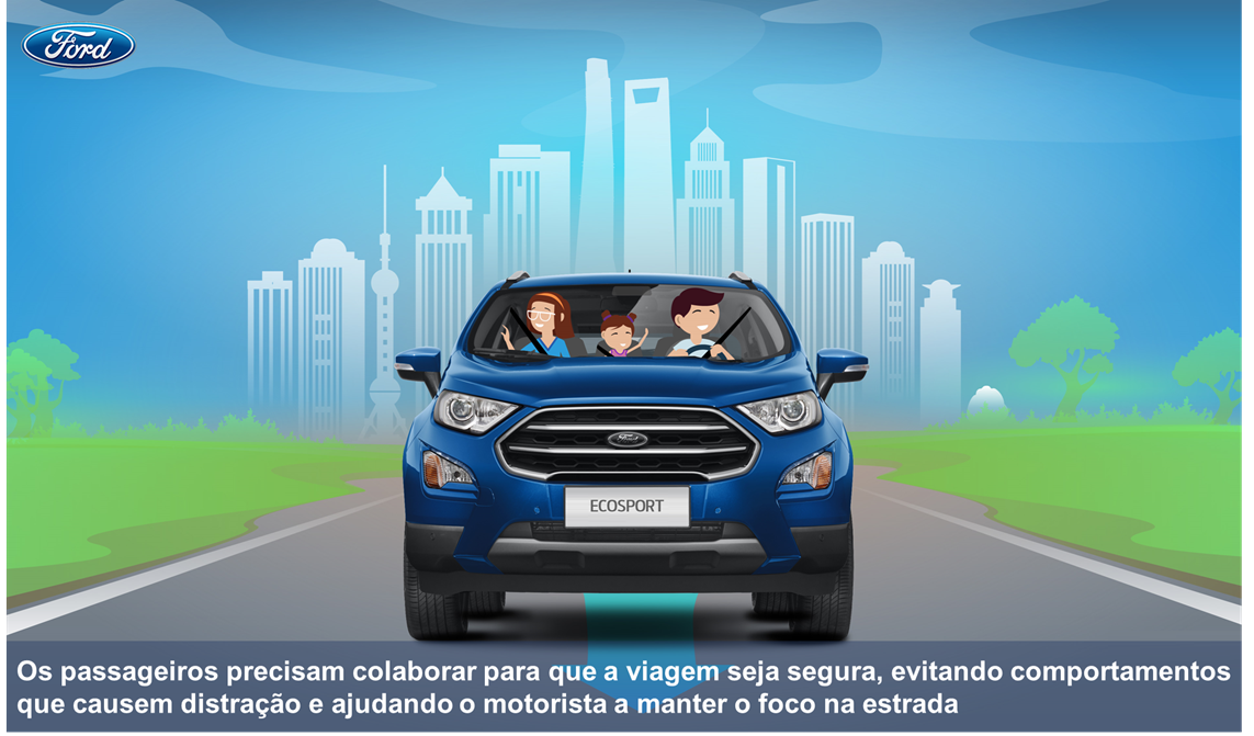 “Os passageiros devem se conscientizar da influência que a sua presença pode ter no motorista”, diz Robson Jardim, supervisor de Operações do Campo de Provas da Ford em Tatuí.  “Eles precisam colaborar para que a viagem seja segura, evitando comportamentos que causem distração e ajudando o motorista a manter o foco na estrada.”