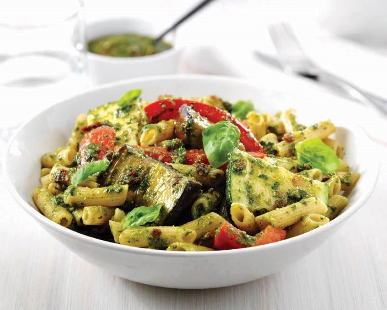 Legumes Assados e Penne ao Molho Pesto