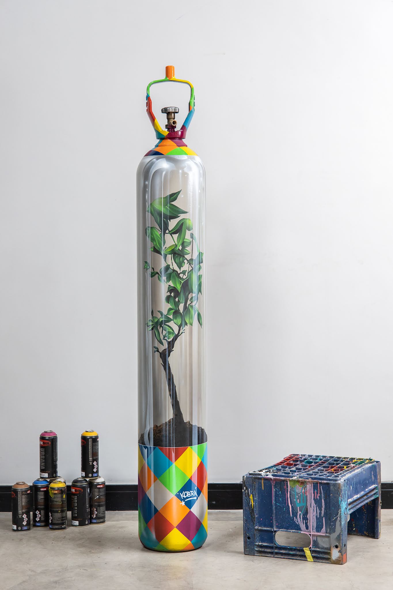 Na primeira ação do recém-criado Instituto Kobra, que tem como base a premissa de que a arte é um instrumento de transformação, o conhecido muralista brasileiro Eduardo Kobra transformou um cilindro de oxigênio, em desuso, de 1m30, em uma obra de arte, exemplar único, chamada “Respirar”. Kobra pintou o cilindro como se fosse um recipiente transparente, com uma árvore plantada dentro. Inicialmente o artista colocaria a obra em um leilão e doaria 100% do valor a instituições que estão sofrendo com a falta de oxigênio. “A mensagem central é a importância da vida. Que o sopro da minha arte ajude a levar um pouco de oxigênio para os hospitais mais necessitados e, ao mesmo tempo, provoque a reflexão sobre a importância de usar máscaras, lavar as mãos constantemente, manter o isolamento social e, claro, de preservar a natureza, que é um patrimônio de toda a humanidade”, diz o artista.