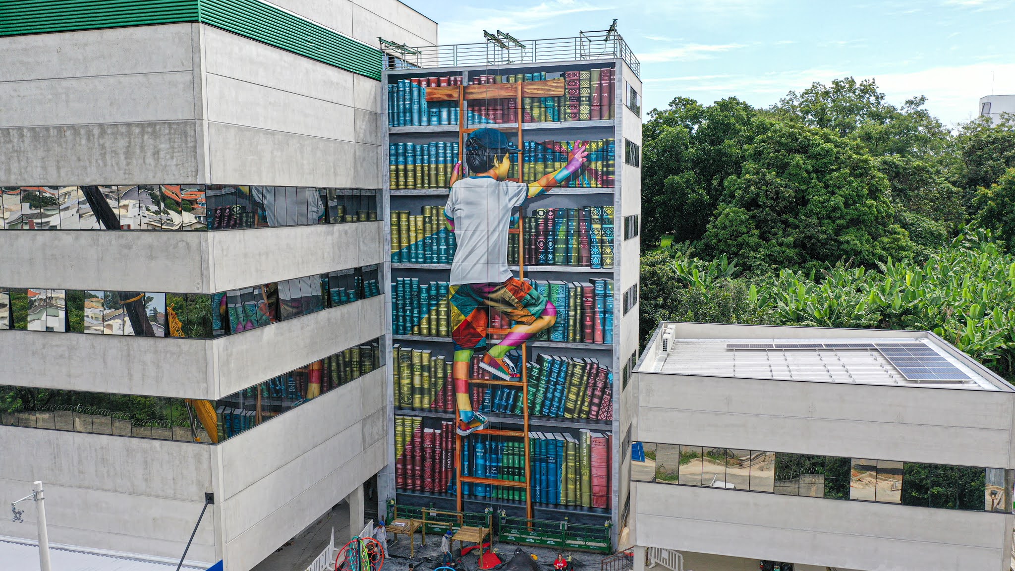 O muralista recebeu cerca 4.000 mil sugestões de títulos nacionais. Os 100 livros mais indicados, além de cerca de 50 escolhidos pelo próprio artista, serão colocados no mural. “O mural já foi entregue, mas estamos voltando para escrever os nomes dos livros que faltam”, conta o artista, que acrescenta: “o menino subindo a escala, à procura do livro, também simboliza a ascensão que a busca do conhecimento possibilita nos mais diversos sentidos. Não é fácil, mas é uma viagem fascinante que podemos buscar e alcançar”, afirma.