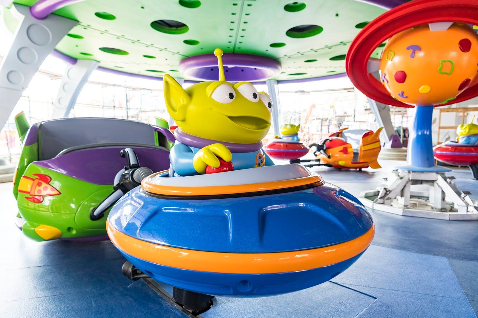 Inspirado no Toy Story 1, a atração é o conjunto de brinquedos que Andy ganhou no Pizza Planet. As naves com foguetes acoplados são pilotadas pelos alienígenas verdes-limão, de 3 olhos, orelhas pontudas e expressões faciais que demonstram alegria ou surpresa. As naves alienígenas com os visitantes a bordo giram e se esquivam de planetas de brinquedo como o Planeta Pepperonia e uma estação espacial em forma de pizza enquanto os alienígenas tentam ser capturados pela “A Garra” que está lá suspensa e tudo ao som de uma trilha sonora composta de 8 músicas “das galáxias” que soam bem familiar, mas apresentadas de um jeito nunca ouvido antes e efeitos especiais com luzes multicoloridas. Tem disponibilidade para FastPass+ e altura mínima é de 81 cm (32 in).