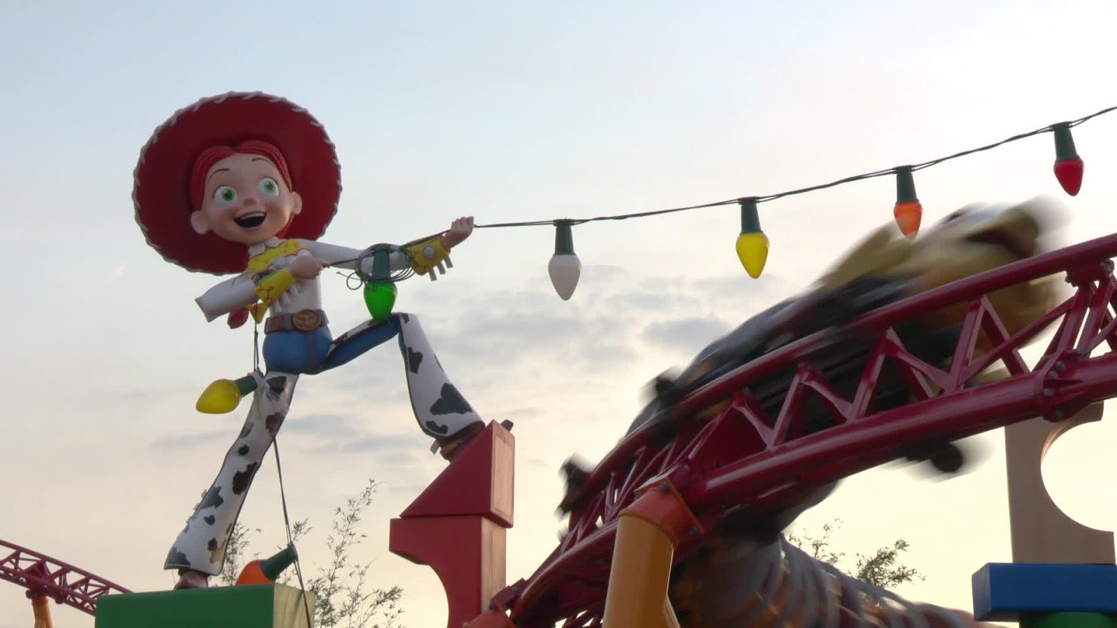 A montanha-russa tem visão panorâmica de toda área. E os brinquedos de Andy (em tamanho gigante) estão espalhados pelo cenário da atração. Em partes onde a montanha-russa dá voltas, o dinossauro Rex se equilibra no alto de um jogo de blocos tentando, com seus braços curtos, decorar uma torre com luzes de natal. Jessie está ali para ajudar.