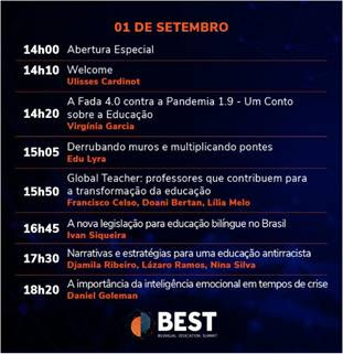 Em um ano atípico, quando a pandemia de Covid-19 afetou todo o mundo, os educadores estão enfrentando diversos desafios para continuar com o desenvolvimento de seus alunos. Com o objetivo de contribuir e ajudá-los no desafio de levar a educação para todo o País, acontece entre os dias 1º e 3 de setembro, a quarta edição do Bilingual Education Summit (Best) – considerado o maior evento bilíngue do mundo.