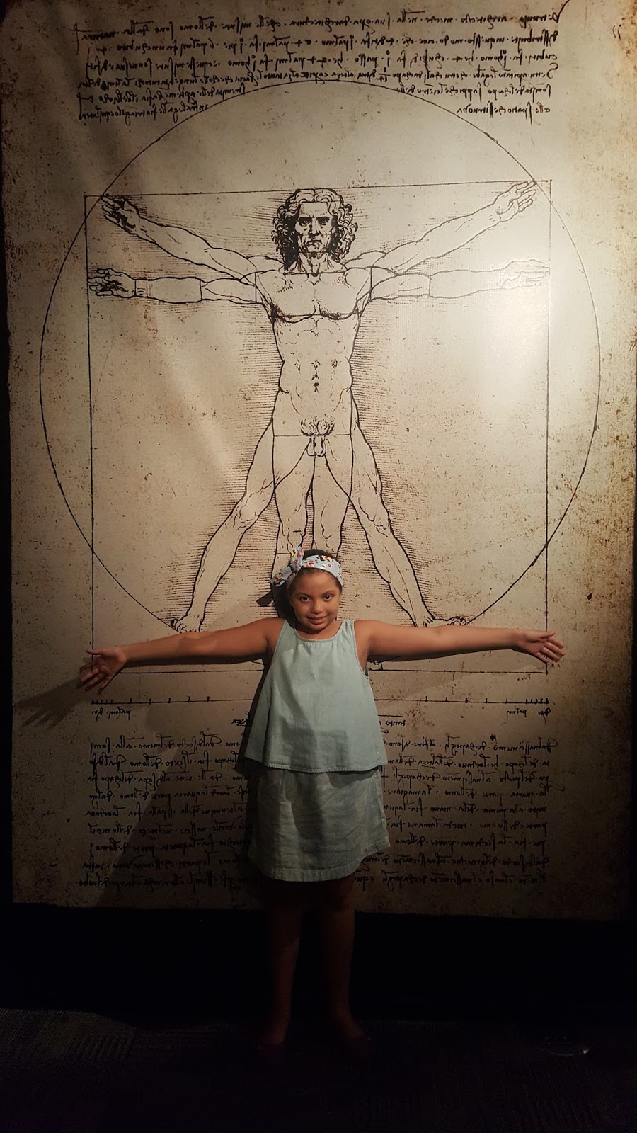 Por meio de uma gigantografia do famoso desenho o público pode brincar fazendo proporções do próprio corpo. Um vídeo revela quem é o homem que serviu de modelo para Leonardo.