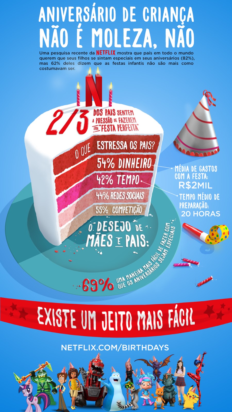 E a ideia é ajudar os pais a deixar o aniversário dos filhos ainda mais especial. Porque as crianças são os reis e rainhas das festinhas, mas a Netflix sabe que, na verdade, os heróis são os pais que admitem sentir uma pressão social para promover festas maravilhosas para os filhos (44%), mas não querem se estressar para torná-las especiais (69%).