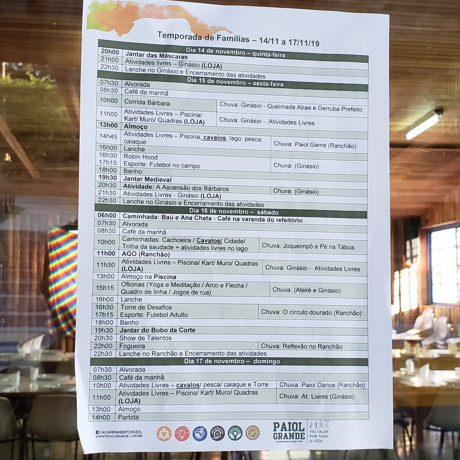 Os dias de férias no Paiol têm uma programação completa com atividades que acontecem desde a hora de acordar até a hora de dormir. E nos horários de atividades livres o acampante pode escolher a atividade que mais se identifica.
