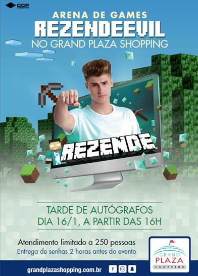 ENCONTRO COM O YOUTUBER – Para tornar a experiência ainda mais emocionante, Rezende Evil visitará o Grand Plaza Shopping para encontro com os fãs. A presença VIP está programada para 16/01, das 16 às 20 horas, com acesso limitado a 250 pessoas, que deverão retirar as senhas duas horas antes do início do evento.