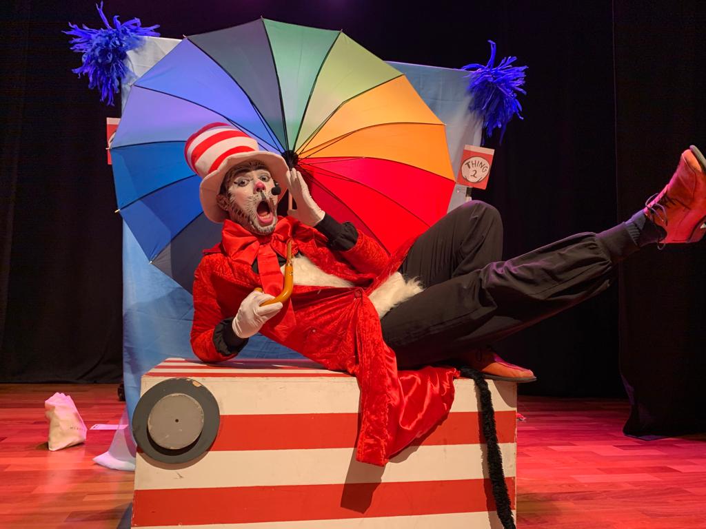 Sinopse: Com uma cartola vermelha e branca, o Gato com seu jeito engraçado irá contar uma história hilária em inglês de dois irmãos muito diferentes que vão enfrentar a volta às aulas. Com muita música, cor e alto astral, o Gato irá mostrar a todos que estar na escola é fundamental e fará disso a melhor parte do dia. Inspirado no livro “The Cat in the Hat”, de Dr.Seuss, o espetáculo é um jogo musicado, destacando a responsabilidade infantil diante do mundo, sem nunca deixar a brincadeira de lado.