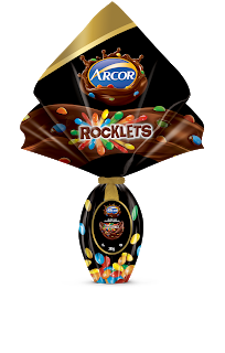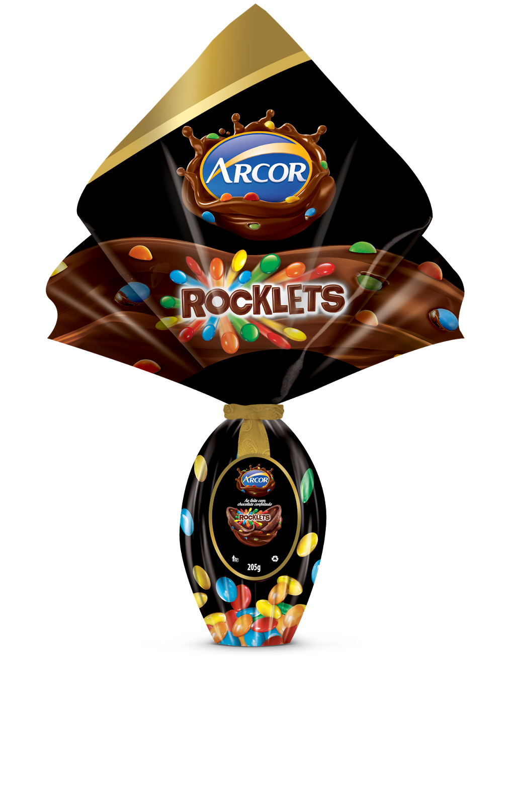 Arcor Rocklets 205g: de chocolate ao leite com confeitos Rocklets na casca.