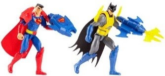 Batman e Superman possuem 11 pontos de articulação, capas macias e acessórios que se encaixam e que podem ser usados como armaduras e equipamentos. Os acessórios podem ser trocados entre as figuras do sortimento, criando transformações inovadoras!