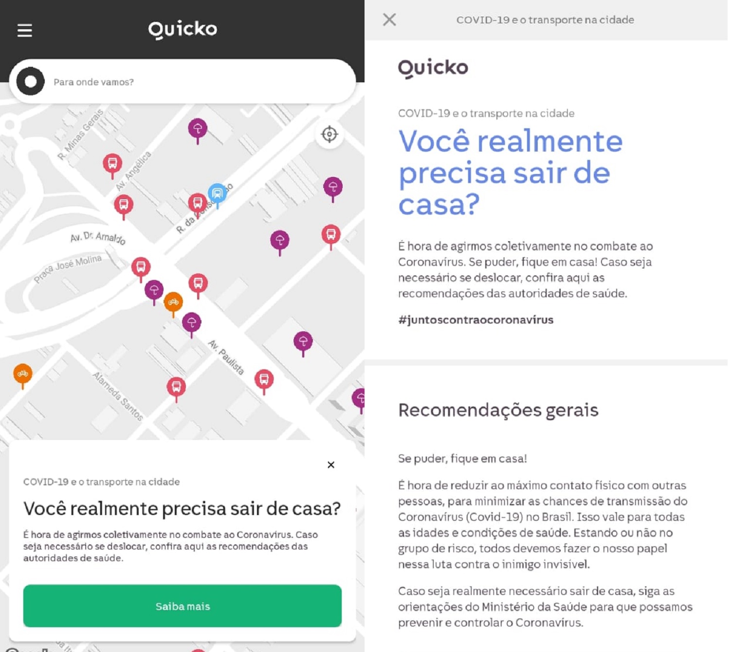 Além das informações sobre o sistema de transporte, a Quicko dá dicas de como se deslocar com mais segurança, adotando as recomendações das autoridades para evitar o contágio.