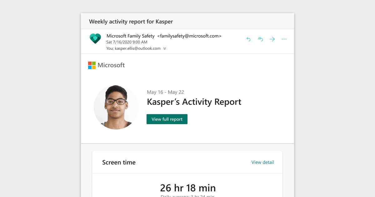 Toda semana, pais e filhos recebem um e-mail com as principais atividades digitais da criança ou do adolescente. Isso cria um mecanismo interessante para iniciar uma conversa entre pais e filhos sobre quanto tempo eles estão gastando em seus dispositivos e quais sites e conteúdo estão visualizando.
