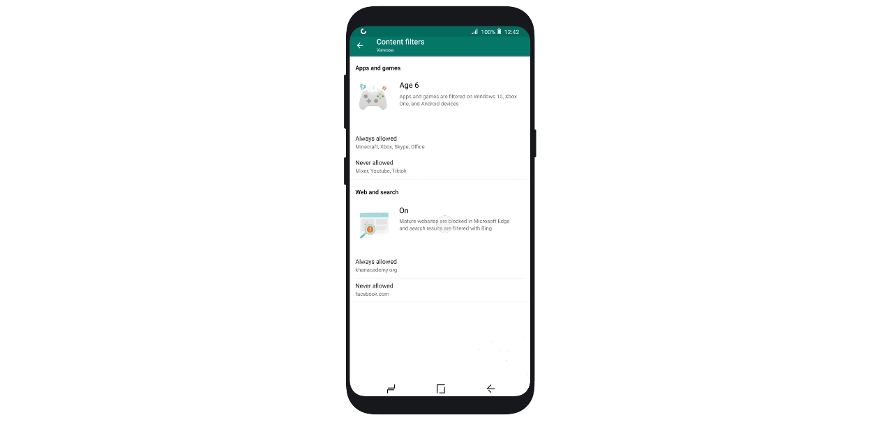 Com o aplicativo Family Safety, é possível usar filtros de web e de pesquisa para bloquear conteúdo adulto e definir a navegação apenas para sites amigáveis para crianças, com uma lista de sites permitidos e outra lista de sites bloqueados. Este recurso funciona de forma integrada no navegador Microsoft Edge executado no Windows, Xbox e Android.