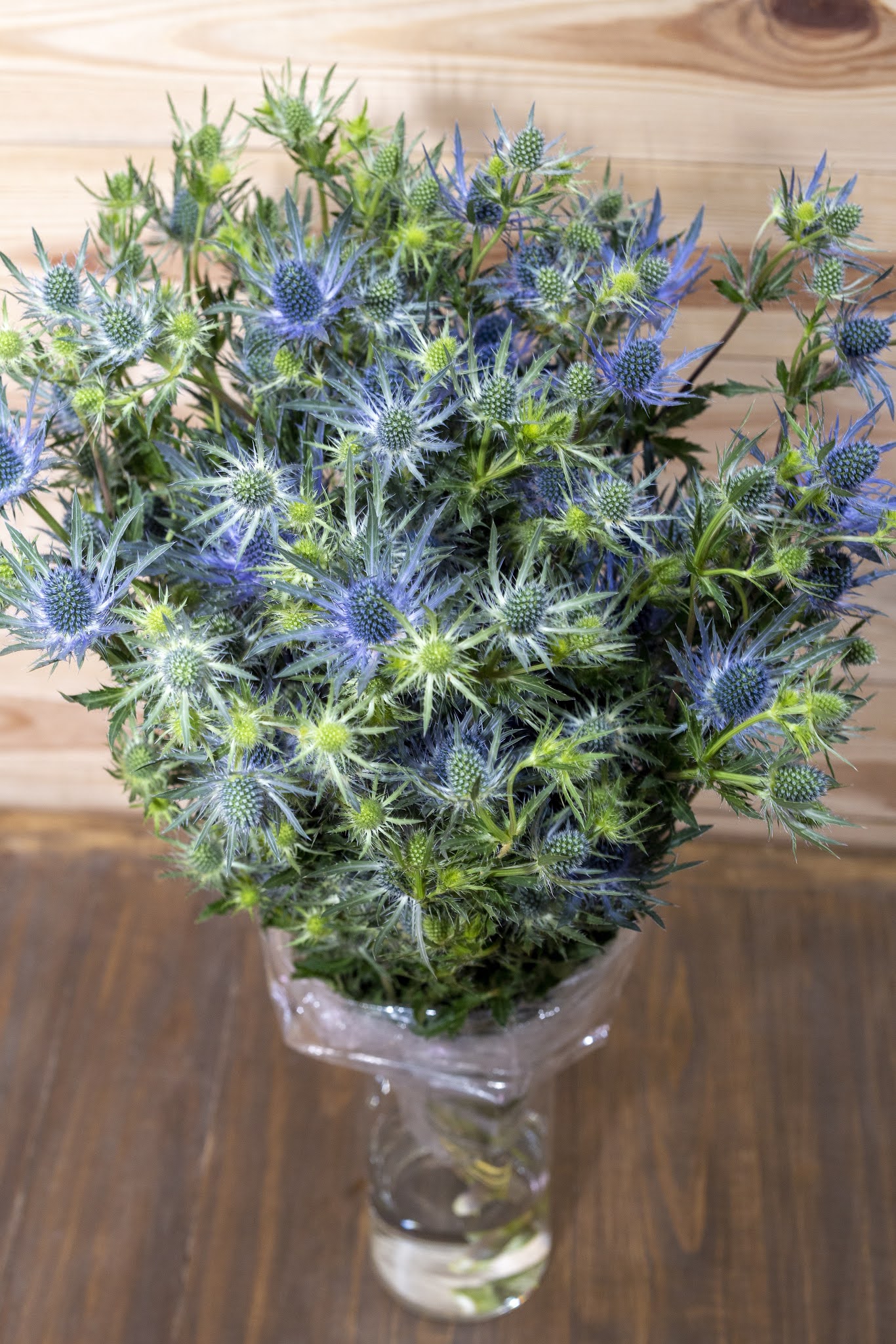 Exótico na coloração com tons nobres, difíceis de serem encontrados na natureza e com formato único, o Eryngium é uma das flores cortadas mais desejadas no mundo. Possuí inflorescências no tom azul-metálico, cercado por uma coroa de folhagens na mesma tonalidade.  As inflorescências mais novas têm um tom matizado de branco prateado, o que assegura o seu exotismo. A folhagem verde-escuro também tem grande apelo ornamental. A flor é ligeiramente espinhosa, com caule grosso e rígido. As hastes atingem de 40cm a 70cm.