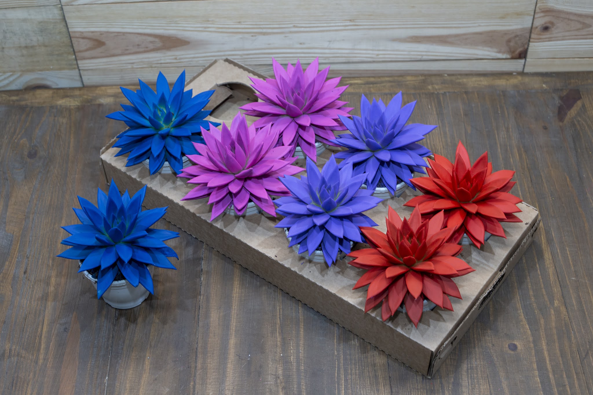 As echeverias colors chegaram ao mercado no início de agosto. Elas são coloridas com a aplicação externa de uma tinta especialmente desenvolvida na Europa para não afetar a planta. A planta não absorve a tinta e continua a se desenvolver normalmente. Elas podem receber a cor desejada, adequando-se a todas as ocasiões e ambientes. Atualmente está disponível nas cores vermelha, rosa, roxa e azul. Novas cores serão lançadas, em breve. Por ser uma planta compacta, adapta-se facilmente em pequenos espaços.