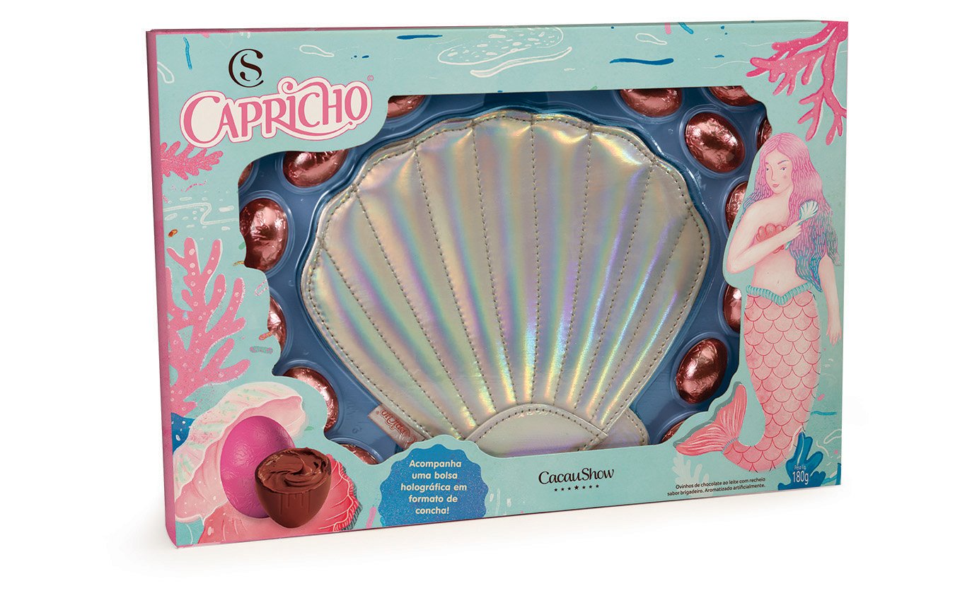 A Cacau Show apresenta uma sugestão repaginada e elaborada especialmente para as adolescentes: a Bolsa Capricho. Com ilustração exclusiva da Capricho, a bolsinha, que tem o formato de concha, vem acompanhada de miniovinhos de chocolate ao leite com recheio sabor brigadeiro. Além disso, há três cores brilhantes para escolher: Dourado, Prata e Rosa.