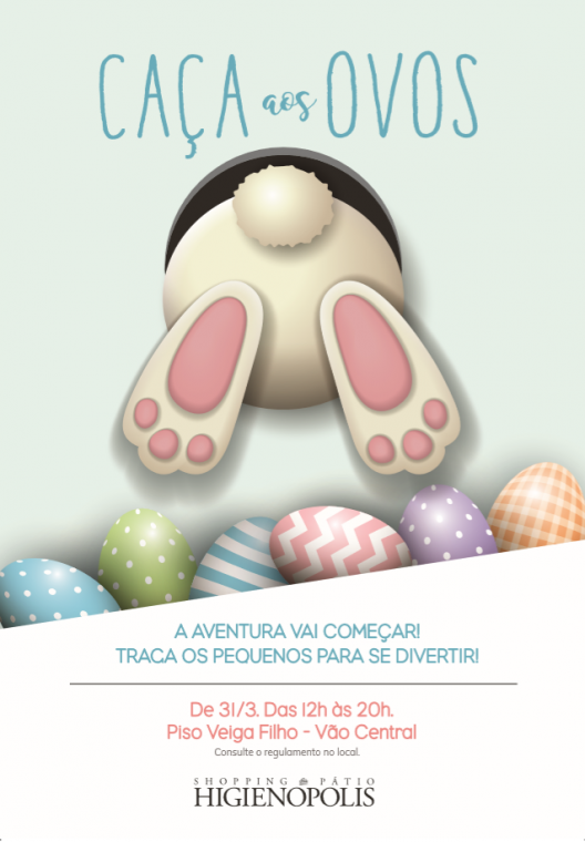 No Sábado de Aleluia , véspera da Páscoa, o Shopping Pátio Higienópolis organiza uma brincadeira de Caça aos Ovos, para as crianças, entre 4 e 12 anos, se divertirem das 12h às 20h. O início dessa aventura será no Piso Veiga Filho (próximo ao Vão Central), onde todas as crianças receberão pistas para caçar os ovinhos. A cada uma das cinco etapas, os participantes ganham ovinhos de chocolate e uma dica para o próximo desafio. As pistas para Caça aos Ovos serão distribuídas por ordem de chegada.