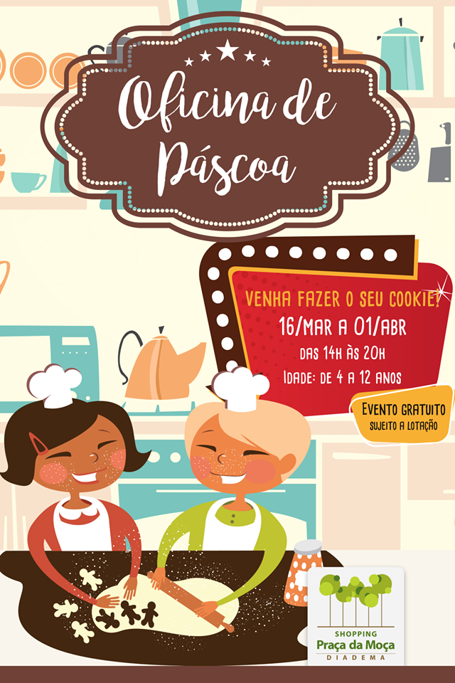 As comemorações de Páscoa no Shopping Praça da Moça, em Diadema, ganha sabor especial com a Oficina de Cookies. Nela, as crianças poderão se divertir a valer e ainda exercitar seus dotes culinários.