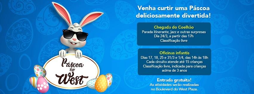 O Shopping West Plaza, na zona oeste de São Paulo, vai promover no próximo dia 24, às 16h, a “Chegada do Coelhão” no Boulevard, espaço aberto do empreendimento, que receberá uma parada de Páscoa regada ao som de jazz. Outros personagens estarão presentes para animar toda a família. Além disso, as crianças poderão se divertir com o Coelhão, que finalizará sua chegada com um meet and great de fotos com toda a família.