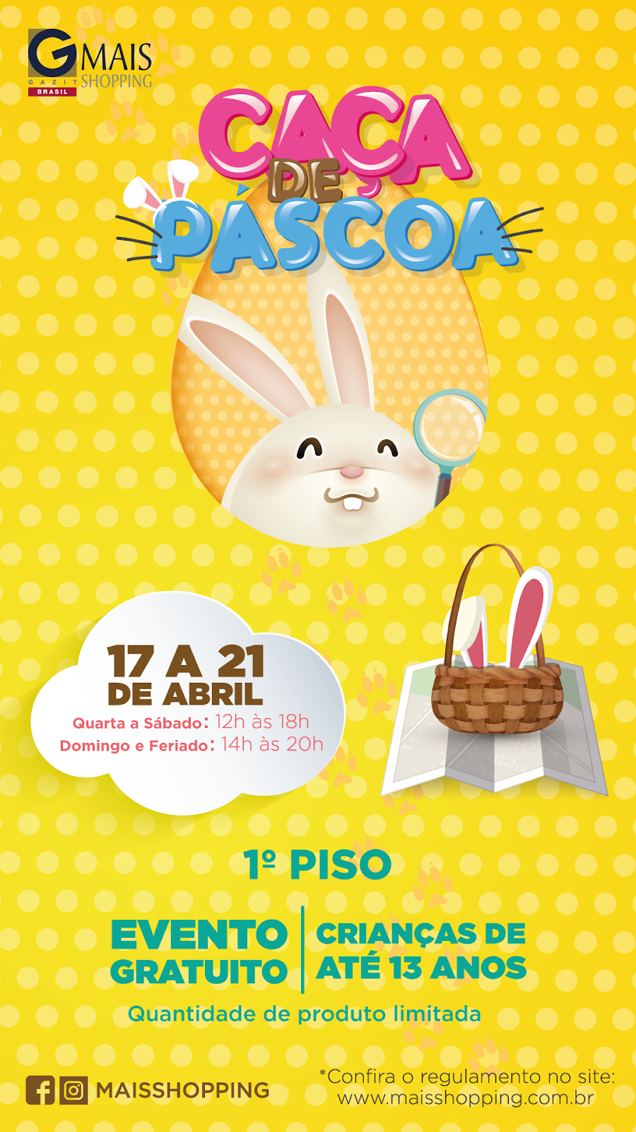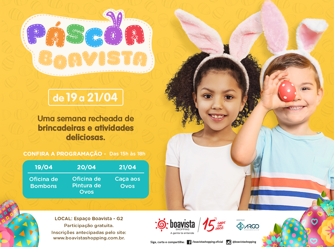 A cada horário, um grupo de até 20 crianças acompanhadas pelos responsáveis, receberão a primeira pista para iniciar o desafio. São pelo menos sete espalhadas pelo shopping. No final, as crianças ainda ganham ovos e brindes do shopping. O evento é gratuito e acontece no Piso G2, no espaço Boavista.