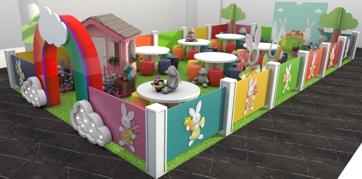 A brincadeira começa no 1º Piso, onde devem retirar o mapa com a localização das lojas, em um espaço totalmente lúdico. Além disso, os participantes garantem no local um par de orelhinhas de coelho e uma cestinha para armazenar os brindes. O ponto de partida conta ainda com pintura facial para que iniciem o trajeto como verdadeiros coelhinhos.