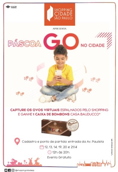 Para comemorar a Páscoa no mais verdadeiro espírito tecnológico e interativo, o Shopping Cidade São Paulo vai promover uma inédita caçada virtual a ovos de páscoa inspirado no Pokémon Go, um dos games de maior sucesso no mundo. Intitulada “Páscoa GO no Cidade”. Na brincadeira, os jogadores terão que caçar ovos virtuais pelo shopping por meio de um aplicativo para celular. Para participar, o cliente deverá fazer um cadastro no ponto de partida localizado entrada principal do empreendimento, e realizar o download do aplicativo.
