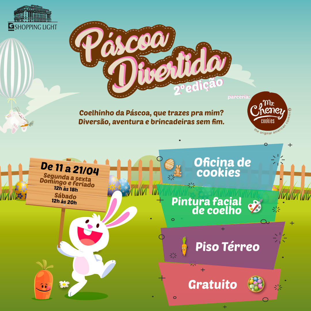 A brincadeira não para por aí. O espaço contará também com mesinhas e cadeiras, onde os pequenos poderão criar orelhinhas de coelho e cestas de Páscoa em EVA. O espaço, que comporta 12 crianças por vez, estará à disposição da garotada entre os dias 12 e 21 de abril, das 12h às 20h. O acesso às atividades é por ordem de chegada.