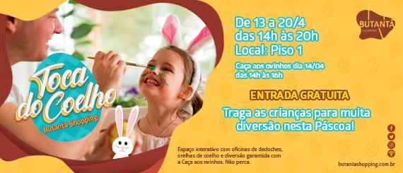 Entre os dias 13 a 20 de abril, o Butantã Shopping promove gratuitamente oficina artística para crianças. Durante este período, o público infantil poderá realizar diversas atividades criativas e lúdicas com a temática da Páscoa. O espaço conta com produção de pintura facial, criação de dedoches – fantoches utilizados nos dedos para contar histórias -, máscaras e orelhas de coelho com papel colorido usando a técnica recorte e cola, além de desenhos para colorir.