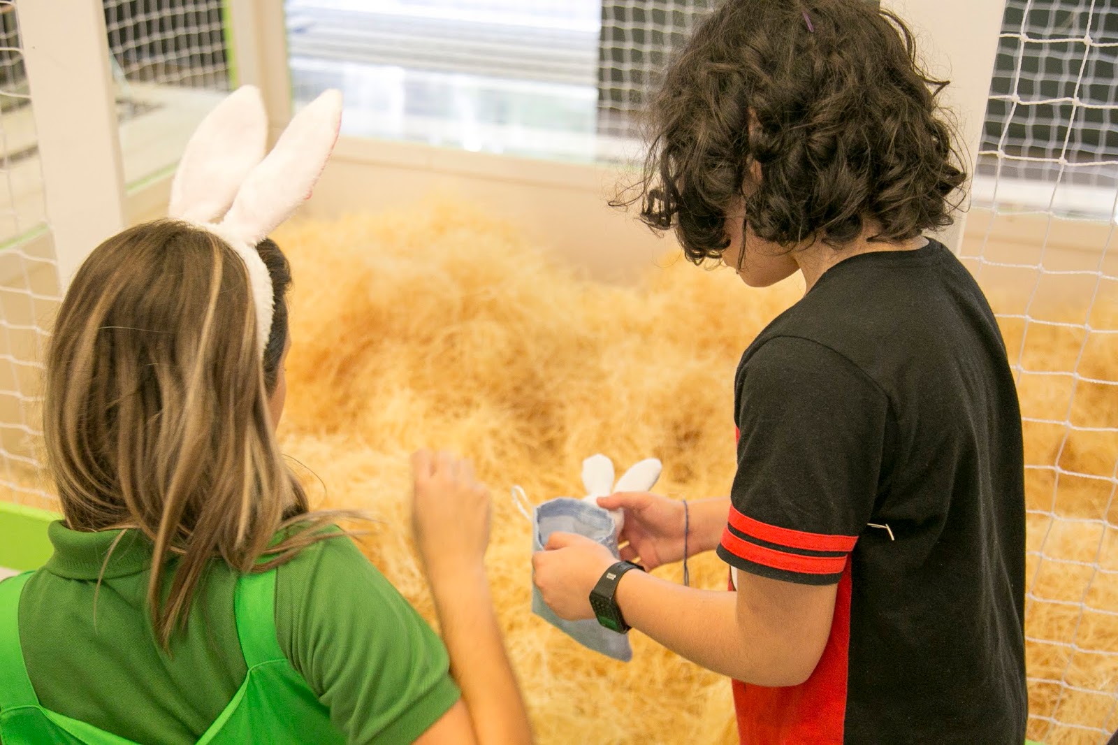 Para oficina de fantoches e coelhoches, os pequenos terão a disposição materias diversos como tecidos, olhinhos, lacinhos e fitas, canetinhas coloridas, cola e tesoura para a confecção dos brinquedos. Monitores estarão no espaço para ajudar as crianças na decoração dos personagens. Para a confecção dos bigodes de coelho haverá também pompom de algodão e palito de madeira.
