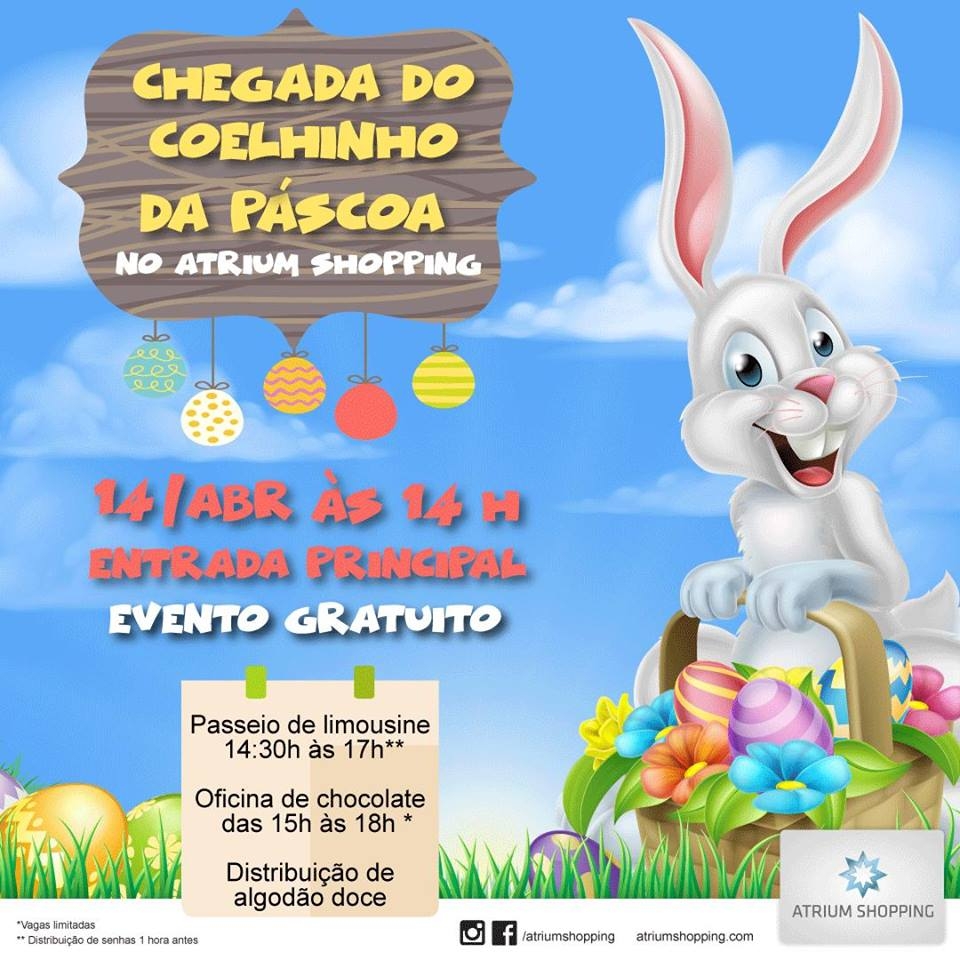 No domingo, 14 de abril, das 14h às 18h, a garotada tem diversão garantida no Atrium Shopping, em Santo André, com uma festança para receber o Coelhinho da Páscoa. A animação começa na entrada principal, às 14h, com a chegada do Coelho e seus assistentes a bordo de uma limousine, recepcionado pelo público e por uma banda de fanfarra, que seguirão em cortejo pelos corredores. Barracas para distribuição gratuita de algodão doce serão montadas no local.