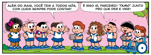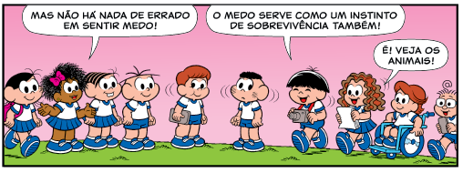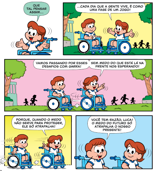 Já na segunda história, os personagens fazem um passeio pelo zoológico e conversam sobre os seus medos. Enquanto a Mônica tem medo de insetos, o Cebolinha, de “extlatelestles”, a Magali, de acabar toda a comida do mundo, o Edu abre seu coração e conta que tem receio de usar cadeira de rodas.