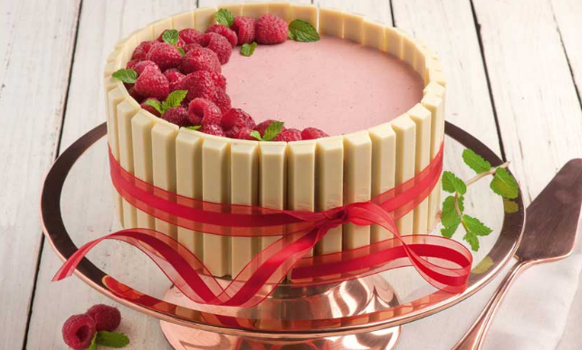 Em uma forma de aro removível (20 cm de diâmetro), cubra toda a lateral com os KITKAT, separados em fingers, e faça uma camada, na base, com os biscoitos. Despeje cuidadosamente metade da Mousse reservada, faça outra camada de biscoitos e acrescente o restante da Mousse. Leve para gelar por cerca de 2 horas, ou até que esteja firme. Desenforme sobre um prato, decore com framboesas, faça um laço e sirva a seguir.