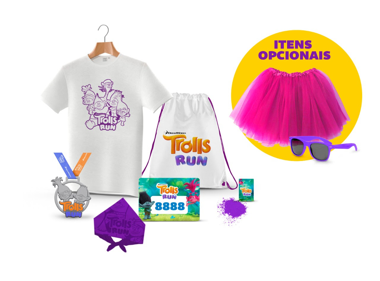O kit inclui: camiseta exclusiva Trolls, ecobag, número de peito, medalha finisher, sachê de pó colorido e bandana.