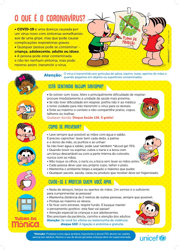 Desde o início da pandemia, UNICEF e a Mauricio de Sousa Produções vêm trabalhando juntos para levar informações à toda população, desenvolvendo diversos materiais com orientações contra o coronavírus por meio dos canais digitais. O UNICEF também apoia as postagens do Movimento Brincadeira, que estimulam as crianças a seguir brincando mesmo no contexto da quarentena, e do vídeo “Sem Abraço, sem Beijinho, sem Aperto de Mão”, com orientações sobre a importância da etiqueta respiratória e distanciamento social, que ganhou versões em japonês e inglês.
