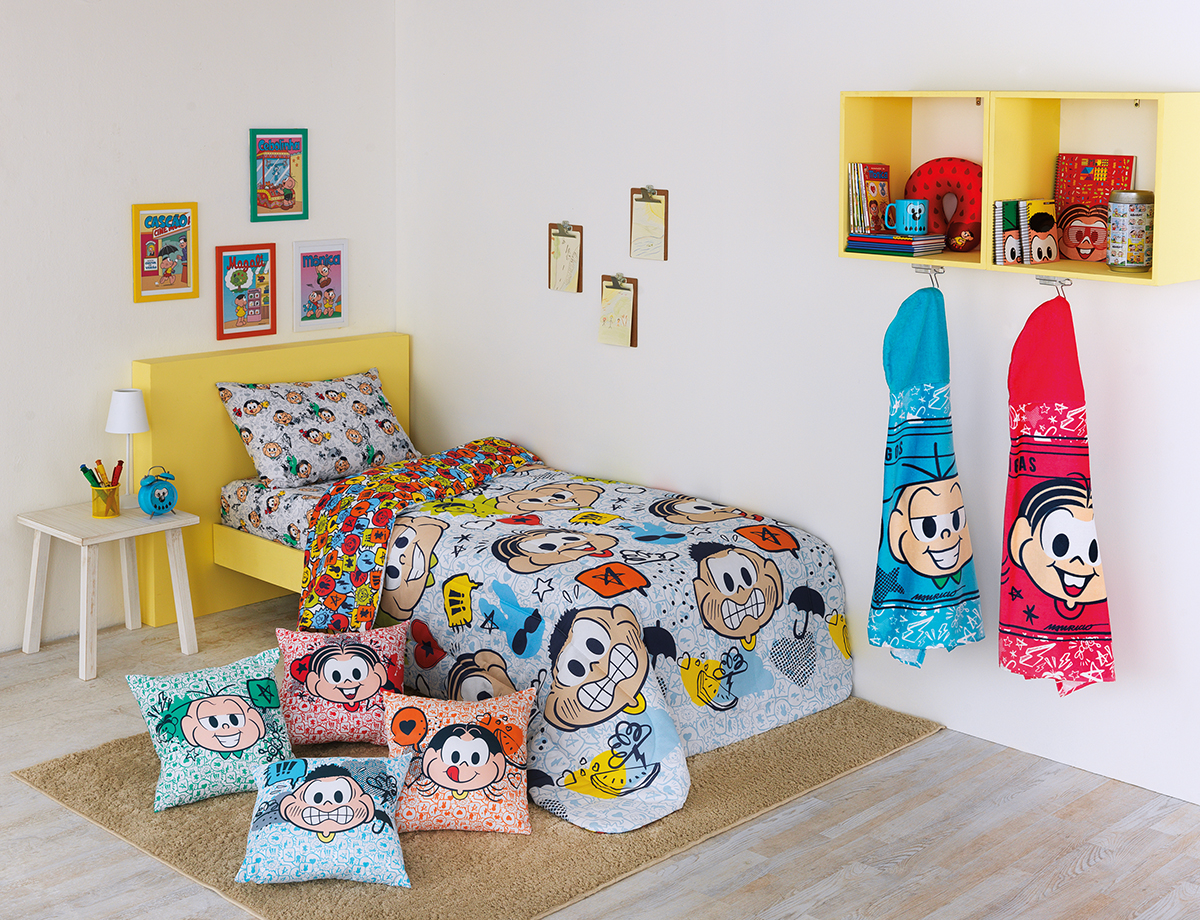 A coleção traz Mônica, Cebolinha, Magali e Cascão em peças coloridas e confortáveis para a criançada fazer o que mais gosta: brincar muito! E para deixar a casa no clima da diversão, a linha para o lar inclui jogos de cama, edredom, toalhas, roupões, almofadas, jogos americanos e outros itens com a cara da Turminha.