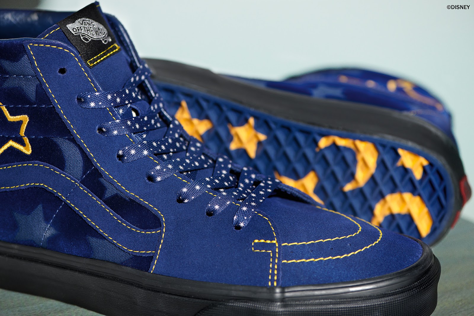 Em 1940, a animação “Fantasia” trouxe a persona mais travessa de Mickey como o “Aprendiz de Feiticeiro”. Inspirado no chapéu do Feiticeiro, o Sk8-Hi foi transformado para incluir painéis em veludo com bordados da lua e estrelas, completos com painéis em camurça azul e costuras em amarelo. O Sk8-Hi do “Aprendiz de Feiticeiro” traz sola preta, cadarços estampados com estrelas e o emblema do “Aprendiz de Feiticeiro” no calcanhar.