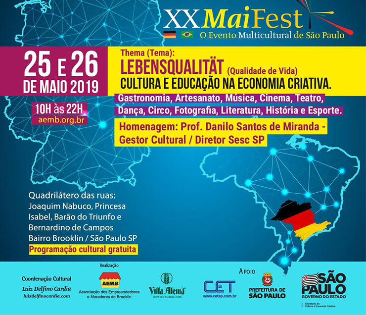 O festival multicultural MaiFest que já está em sua vigésima edição é realizado pela AEMB – Associação dos Empreendedores e Moradores do Brooklin, e desta vez traz como tema “Lebensqualität (Qualidade de Vida), Cultura e Educação na Economia Criativa” como forma de valorizar o trabalho da AEMB em seus festivais realizados há 25 anos através do alinhamento entre a cultura e a educação e isso tudo em um sistema de qualidade de vida que agrega gastronomia, música, cultura, educação, artesanato, economia criativa e valorização dos empreendedores dentro de uma visão holística, muito além de vincular o bem-estar apenas na área de saúde e a essência deste conceito é o Gestor Cultural, o Sr. Danilo Santos de Miranda, Diretor do Sesc SP que será um dos homenageados durante o festival.